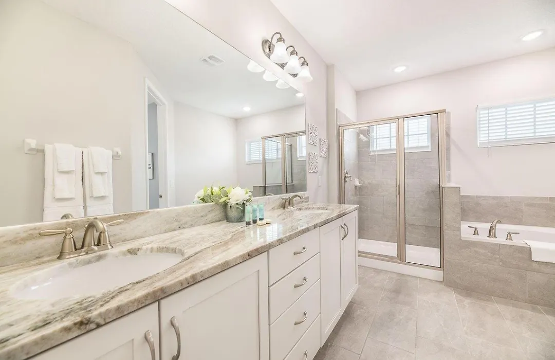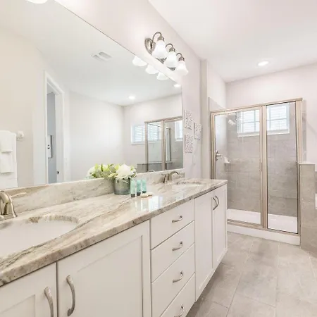 Die Sophisticated 6 Bdrm Villa With Movie Room At Encore verfügt über ein Badezimmer mit einer Dusche und einer Waschmaschine. Ein Haartrockner, kostenlose Toilettenartikel und Badelaken werden auch angeboten.